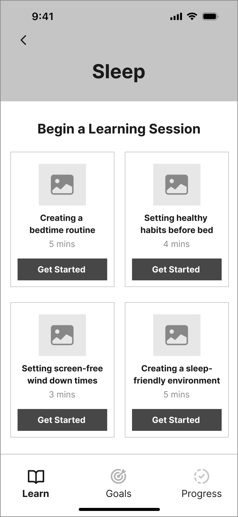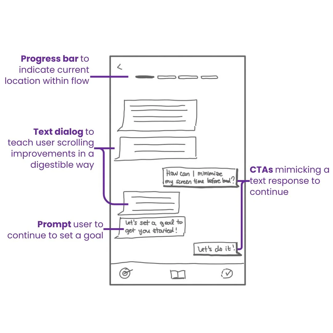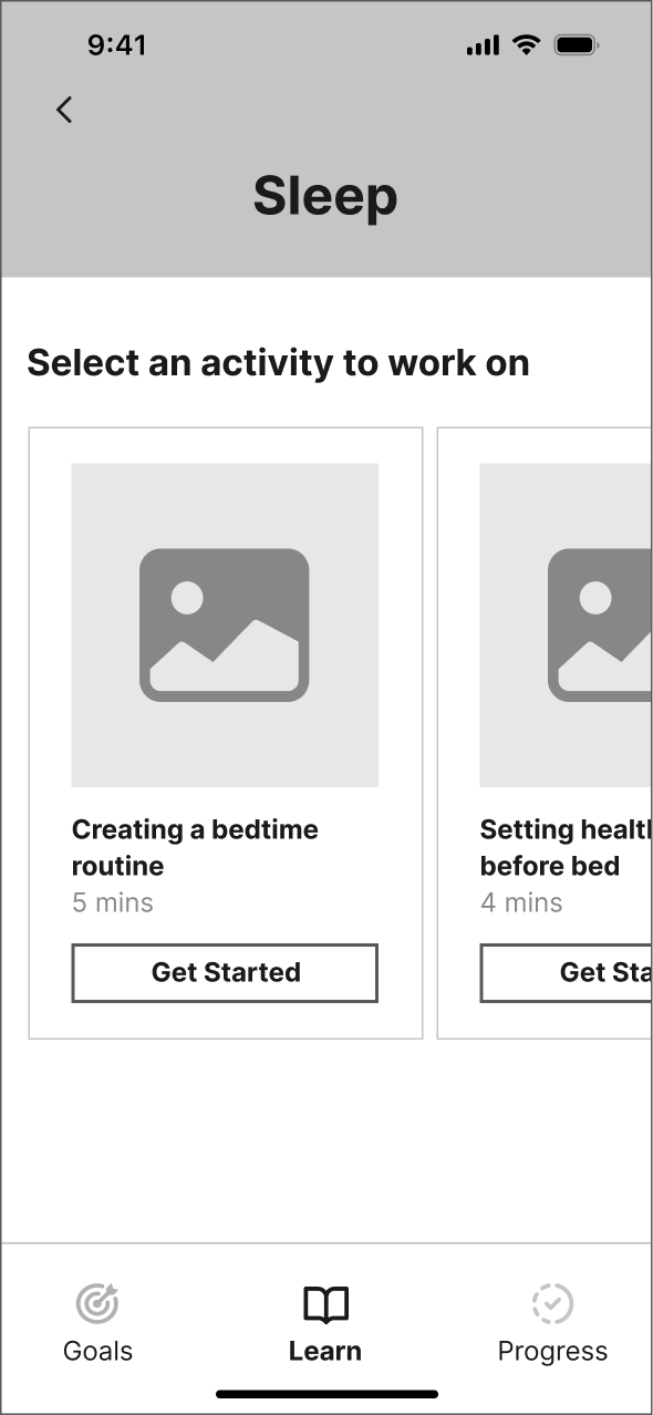 From the wireframes, I developed an initial interactive greyscale prototype. I then conducted two rounds of usability testing, with five participants in each round. The objective was to gather real-time feedback on the user experience of completing a learning session tailored to Priya's goal of enhancing her scrolling habits for better mental health.