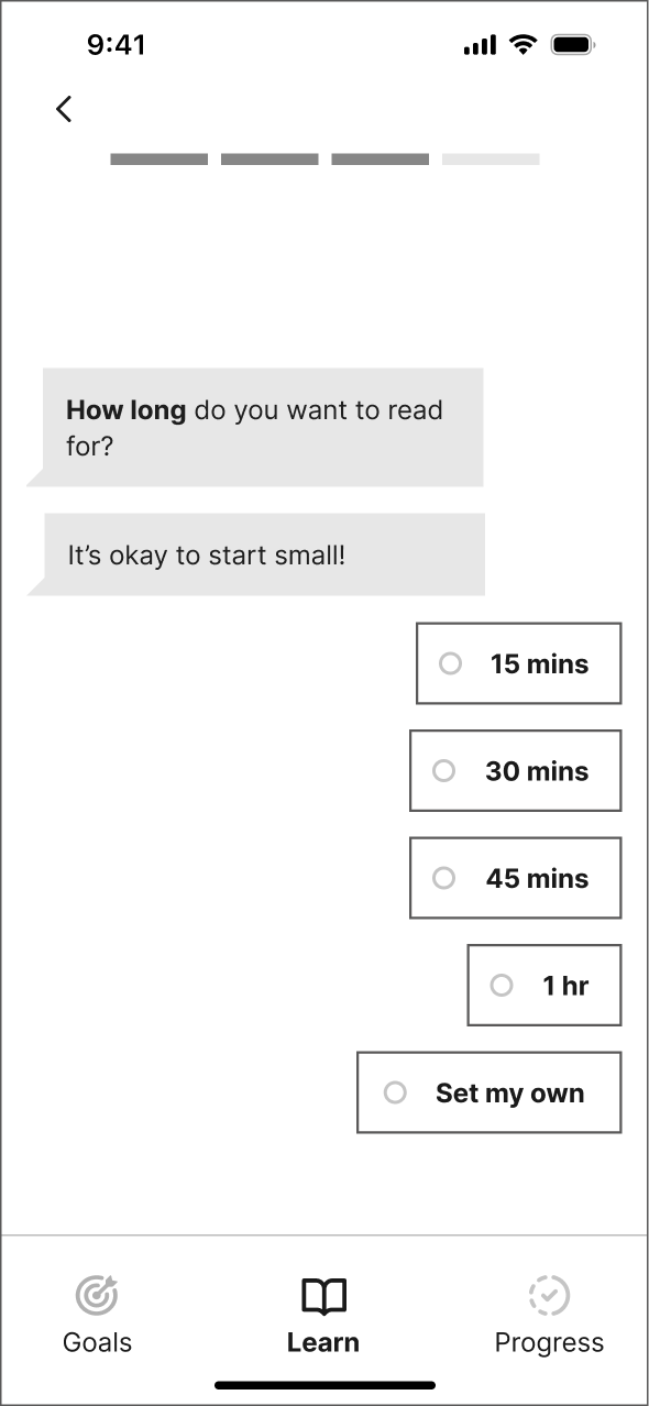 Testers found the progress meter confusing. One tester mistook it for representing the learning session instead of overall progress towards mastering "sleep". This prompted me to rethink how I could better present Priya's progress and motivate her to achieve her goals.