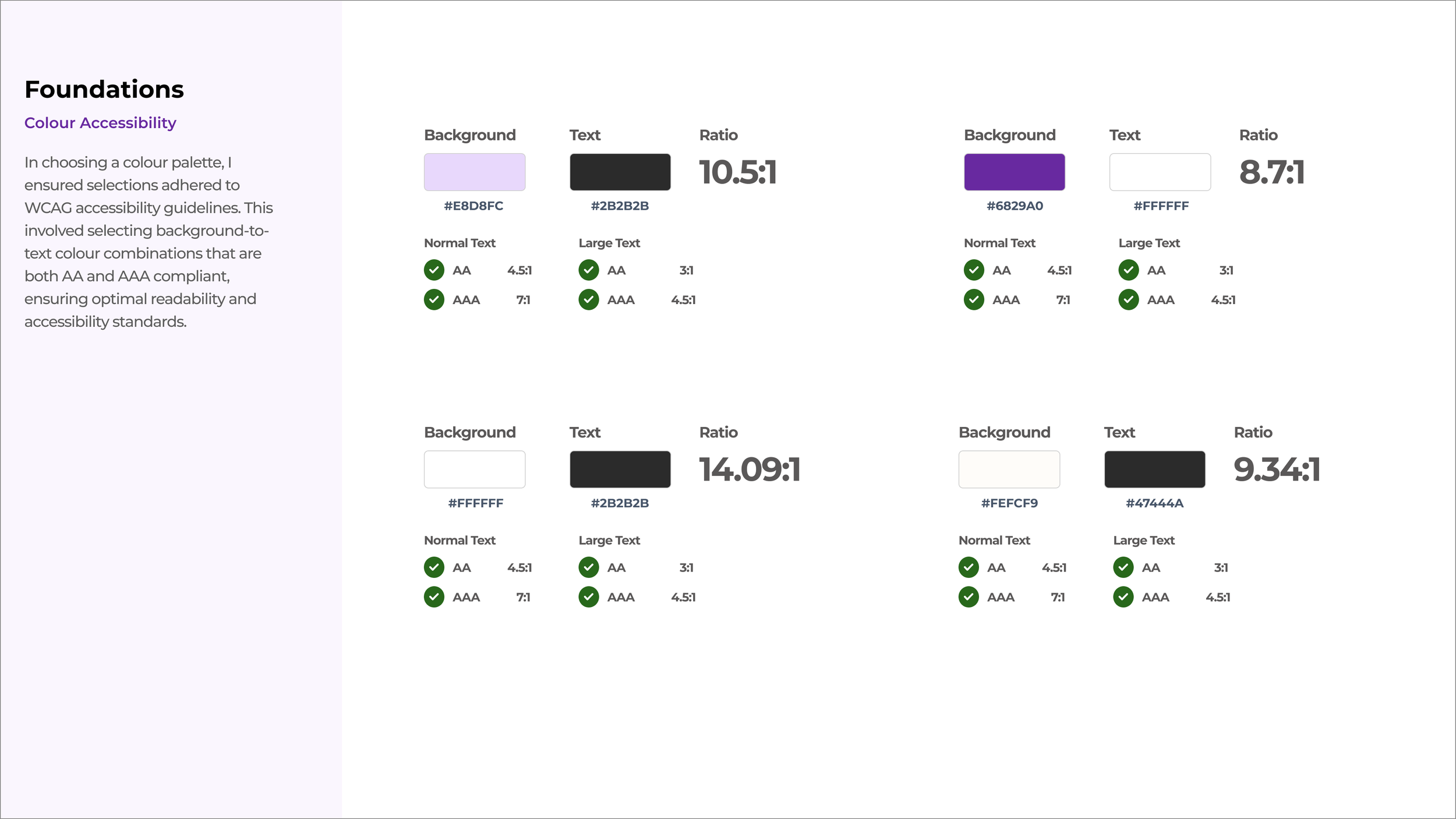 In choosing a colour palette, I ensured text colours adhered to Web Content Accessibility Guidelines (WCAG) 2.1. This involved selecting background-to-text colour combinations that are both AA and AAA compliant, ensuring optimal readability and accessibility standards.